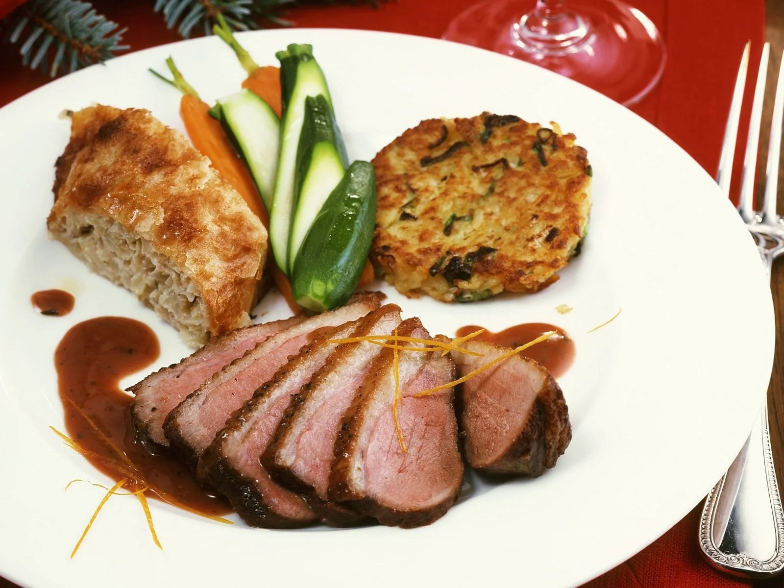 Remove duck breasts from the oven, let rest briefly, cut into slices and serve with the sauce on warmed plates. Serve garnished with orange zest. If desired, serve with cabbage strudel, steamed vegetables and potato cakes.